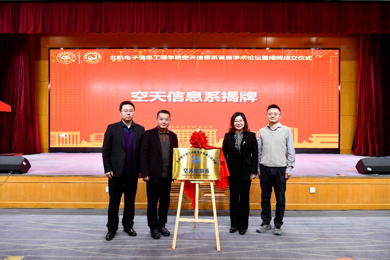 随后,副董事长邓怡、经理曹先彬、学科方向带头人徐迈、系主任于泽共同为空天信息系揭牌。与会嘉宾与空天信息系老师合影留念。